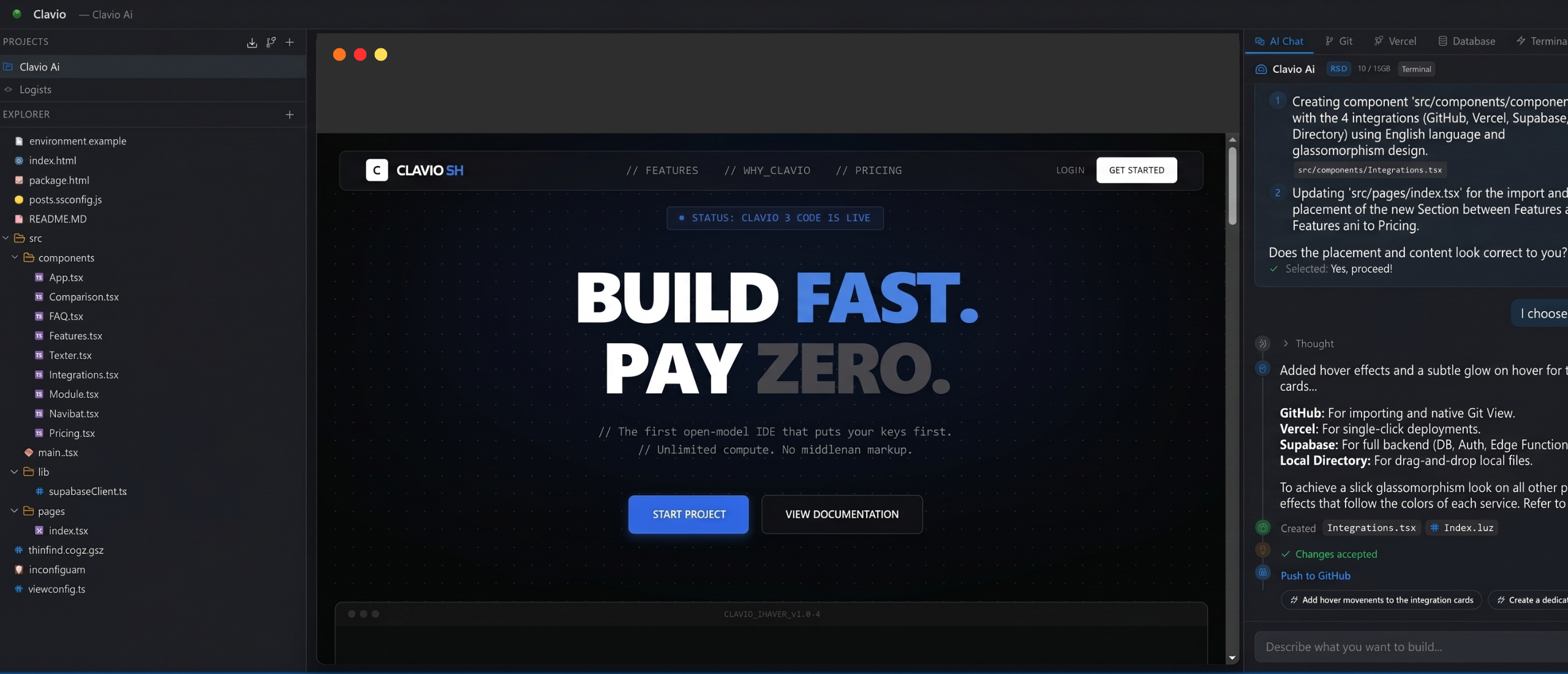 Ναι! Το Clavio έχει native integrations. Μπορείτε να κάνετε commit στο GitHub, να διαχειριστείτε τη Supabase βάση σας και να κάνετε deployment στο Vercel με 1 κλικ, όλα μέσα από το IDE.